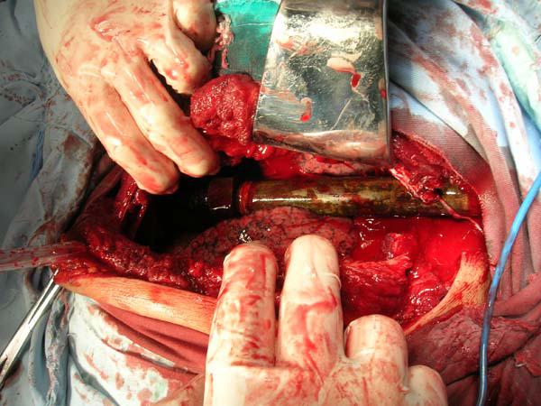 患者 男,32岁。因“10米高处坠落致钢管插入左侧胸部40分钟”于2008年6月30日11时30分由120车接回急诊科。查体:P104次/分,R26次/分,Bp94/54mmHg,SPO298%。神志清醒,右侧卧位,钢管插入贯穿左胸部(图片1),钢管长度49cm,直径约3cm,经左第3前肋间撞入,斜向后方于胸椎旁第5后肋间穿出。钢管前方为直角接口,中段有圆形开关。左侧胸壁塌陷,左上肺叩诊过清音,左下肺叩诊浊音,左肺呼吸音减弱。HR104次/分,律齐,心音有力,各瓣膜听诊区未闻及病理性杂音。胸外科会诊后立即作术前准备,送手术室在气管插管全身麻醉下行伤口清创术及经左侧第5前肋间开胸探查术。术中见:左前胸壁入口及胸背出口损伤严重,左侧第2~6肋多根多处粉碎性骨折,钢管自左上肺舌叶贯穿斜裂穿出,上、下叶挫裂伤,细支气管及伴行血管破裂漏气出血,胸腔内积血约1300ml。心脏、心包、肺门结构、膈肌未见异常。扩大伤口,开胸直视下将钢管从后往前拔出(图片2及图片3),切除部分舌叶,缝扎细支气管及小血管,修补上、下叶挫裂伤的肺组织,大量稀碘伏冲洗胸腔,用10号丝线将第3前肋缝吊于胸大、小肌,以钢丝钻孔固定第4、5肋骨多处以稳定胸壁。安置上、下胸腔引流管。术后1周拔除胸管,12天拆线,伤口愈合II/甲级。2008年7月17日行右足舟骨骨折并舟距关节脱位、跟骨骨折切开复位克氏针内固定术。2008年9月23日拔除克氏针并下地活动。2008年11月20日出院(图片4),随诊1年2个月,情况良好。