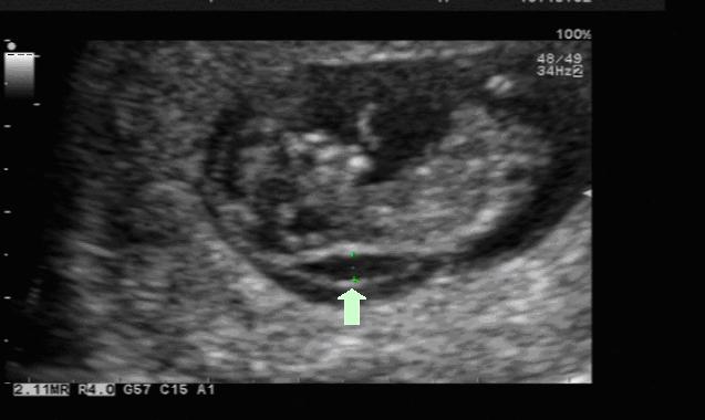 图1:NT正常的胎儿(箭头所指处即为NT) 图2:NT增厚的胎儿(箭头所指处即为NT)