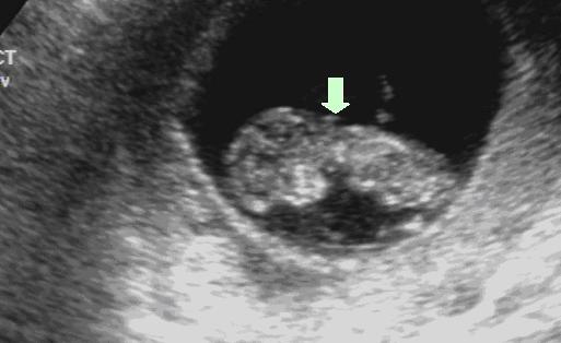 图3:NT正常的胎儿(箭头所指处即为NT) 图4:NT增厚的胎儿(箭头所指处即为NT)