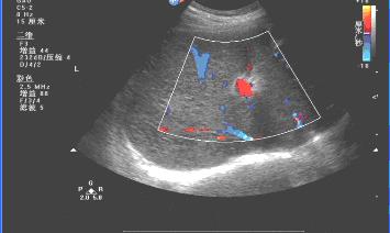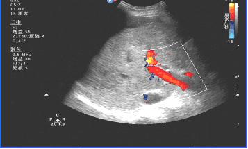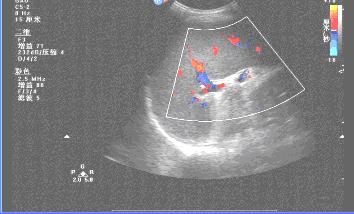 肝回声增粗,肝内血管走行不规则,脾大。