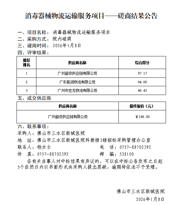 消毒器械物流运输服务项目(第二次)采购公告 佛山市三水区新城医院现就消毒器械物流运输服务项目进行采购,欢迎符合资格条件的供应商前来。一、项目名称:消毒器械物流运输服务项目二、项目预算金额:¥144000元三、采购数量:1项四、项目...