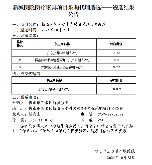 新城医院医疗家具项目采购代理遴选——遴选结果公告