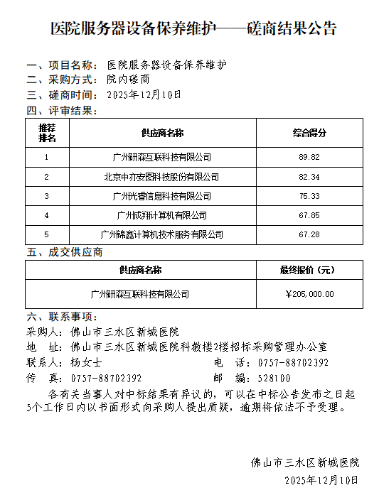 医院服务器设备保养维护——磋商结果公告