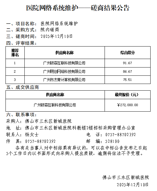 医院网络系统维护——磋商结果公告